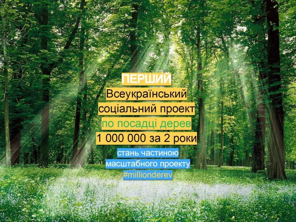 Мільйон дерев - це перший всеукраїнський соціальний проект по посадці дерев. За 2 роки спільними зусиллями людей і компаній ми посадимо мільйон дерев. Для кого цей проект? Захисники екології та соціально-активні люди. Фонди та організації. Компанії, приватні підприємці. Садові центри. Жителі та гості України. Кожен може стати частиною проекту! Що буде, коли ми разом посадимо мільйон дерев? Ми забезпечимо 3 мільйонам людей добову норму кисню. Наші ліси щорічно будуть фільтрувати до 132 тисячі тонн речовин, які забруднюють повітря. Ми посадимо близько 2500 га лісу. Це приблизно 10% від загального обсягу незаконних вирубок в Україні. Ми створимо співтовариство відкритих людей, де кожен зможе внести свій внесок в Здорове Суспільство і Природу Ми залишимо Зелену і Квітучу України нашим дітям і майбутнім поколінням.